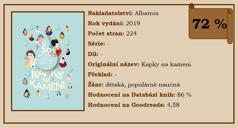 Kapky na kameni mají dobrý, byť nepůvodní nápad, zaujmou vizuálním zpracováním, které je velmi působivé, a neurazí ani texty. Zároveň však jsou v mnoha ohledech spíše feministickou učebnicí dějepisu než knihou, která může inspirovat malé holčičky, aby se nebály jít za svými sny. Jsem ráda, že podobné knihy vycházejí i že vznikla naše česká mutace, zároveň si však myslím, že to mohlo, především co se výběru osobností týče, dopadnout výrazně lépe.